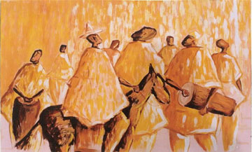 ![]() DAMBA FESTIVAL 90cm x 60 cm: Painting on canvas.depicting Muslims celebrating the birth of Mohammed in the northern part of Ghana. They play drums and dance whilst the chief or the king sits on the horse to honour the occasion. |