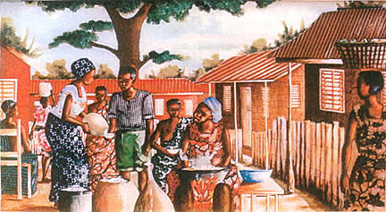 ![]() DRINKING PALM WINE Collage, 90cm x 60 cm. Farmers drinking palm wine a local beer after day's work on the farm. They normally take the palm wine with cooked meat. |