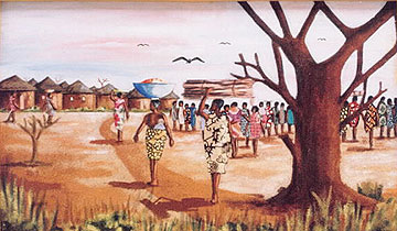 ![]() BRIGHT AND SUNNY DAY Collage 90 cm x 60cm The lifestyle in the northern part of Ghana. One can see some of the people going and coming from the market. |
